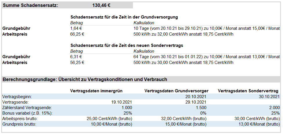Schadensersatzansprüche müssen konkret beziffert und belegt werden, ansonsten werden diese vor Gericht oder im Schlichtungsverfahren abgelehnt (siehe Beispiel). Konkret heißt dies, dass Sie tagesgenau die Mehrkosten zwischen den Vertragskonditionen von Ihren/m neuen Anbieter/n und den Vertragskonditionen mit Ihrem alten Anbieter berechnen müssen. Um diese Berechnung zu vereinfachen, habe ich dieses Excel-Tool entwickelt. Wichtig ist dann noch, dass Sie die Nachweise über die Tarifkonditionen