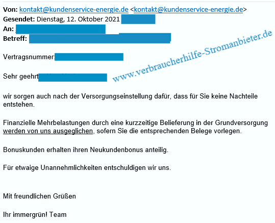 Allen eMails mit Ankündigungen von immergrün Strom habe ich widersprochen… Versorgung wurde dennoch eingestellt.